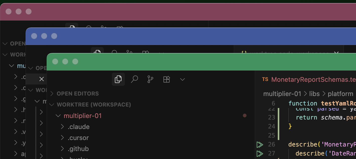 git reset --hard mainNow each worktree can have its own branch, and it's easy to open up separate instances of Claude Code, Cursor, whatever in each directory. I tend to open an instance of Cursor with its own embedded Claude Code in each. On a Mac, ⌘-` lets me quickly toggle between instances of the same application. But it can be hard to quickly grok which instance I'm looking at, so I take an extra configuration step to visually distinguish each worktree. For this I use the VSCode Peacock extension, but it could also be managed manually if you don't want to install another extension.